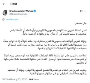 وأكدت شيرين في بيان صحافي نشر عبر حسابها الشخصي بموقع (إكس) أنها تخاطب جمهورها العزيز مباشرة، وتطمئنه بأنها تُدرك خطواتها جيداً، وأن مسيرتها الفنية الطويلة وما مرت به من مواقف وتجارب -سواء كانت جميلة أو صعبة- منحتها الخبرة الكافية لاتخاذ قراراتها بنفسها.
